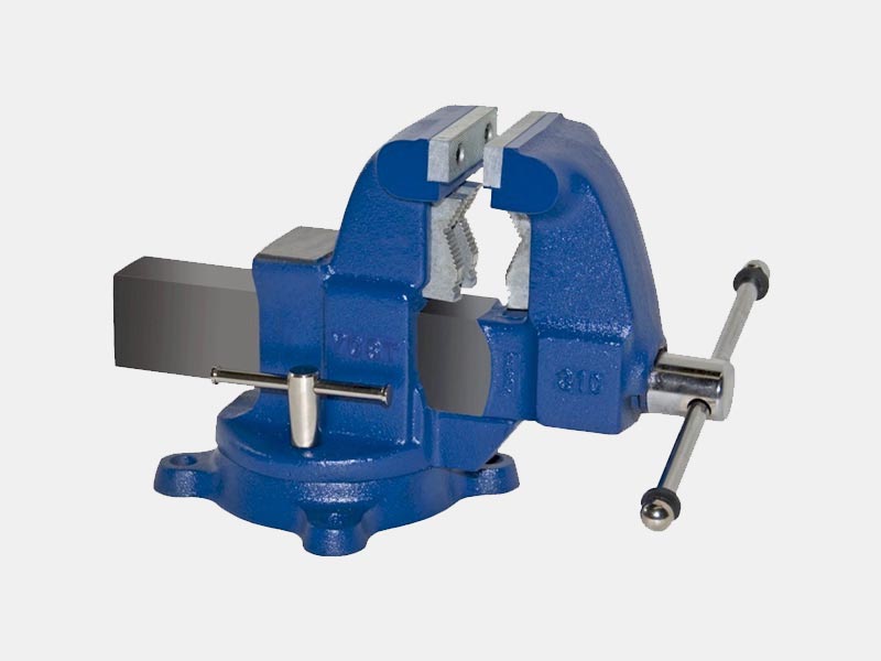 Bench vise with swivel base has a 6.5" jaw width to grip a flat surface and provide clamping action for medium-duty applications, and has a reversible front jaw that expands the jaw opening from 7" to 11" for larger applications