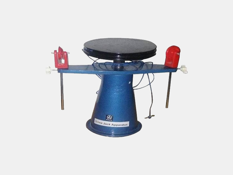 All metallic construction accurately machine cut screw with a pitch of 5 mm carrying double flanged turned table of about 20 cm dia. Fitted on a heavy cast iron base and complete with two adjustable pulleys, cord & hooks without weights.