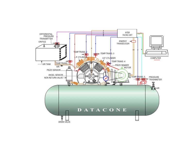 The test rig consists of Air Compressor with an air suction tank, is fitted with an orifice at one end & other end connected to cylinder. The orifice pressure tapping is connected to differential pressure transmitter on panel. Temperature transmitter T1, T2, T3 ,T4 , T5reads temperature at inlet ( T1 ) outlet Temperature from 1st cylinder ( T2 ) & after intercooler temperature ( T3 ) , after 2nd cylinder ( T4 ) and Tank Temperature ( T5 ) records temperature of air. Energy Transmitter is used to record the power input to motor & in turn the work required for compression. The control panel houses starter for motor, main switch, Temperature Indicator. A pressure and angle sensor provided for plotting PV Plot on computer. Suitable scada software provided for analysis.