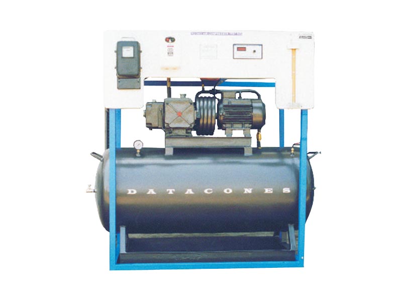 The test rig consists of Air Compressor with an air suction tank, is fitted with an orifice at one end & other end connected to cylinder. The orifice pressure tapping is connected to one limb of U -Tube manometer on panel. Thermocouple T1, T2, T3 reads temperature at inlet ( T1 ) outlet Temperature ( T2 ) & ( T3 ) records temperature of air in receiver. Energy meter is used to record the power input to motor & in turn the work required for compression. The control panel houses starter for motor, main switch, Temperature Indicator.