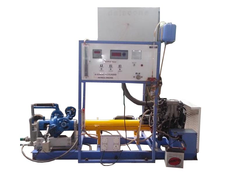 The Setup Consist of Three cylinder four stroke petrol engine (BrandNew). A Propeller shaft is used to couple the engine to the rope brake / hydraulic brake / electric / eddy current dynamometer as aloading device. The air box with orifice plate and manometer is provided for measurement of air to the engine. A fuel tank with fuel measuring unit with scale is provided. The shell and tube type calorimeter is provided at exhaust of the engine. Digital temperature indicator with thermocouple is provided for measurement of temperature at eight different locations. A speed is measured by using tachometer. A rotameter is provided for measurement of water flow to the engine and calorimeter. Load on the engine is measured by using dynamometer accessories.The cylinder power it cut off using switches. Necessary water and air pipe connections are provided. The entire setup mounted on sturdy MS frame with powder coated and good color combination.