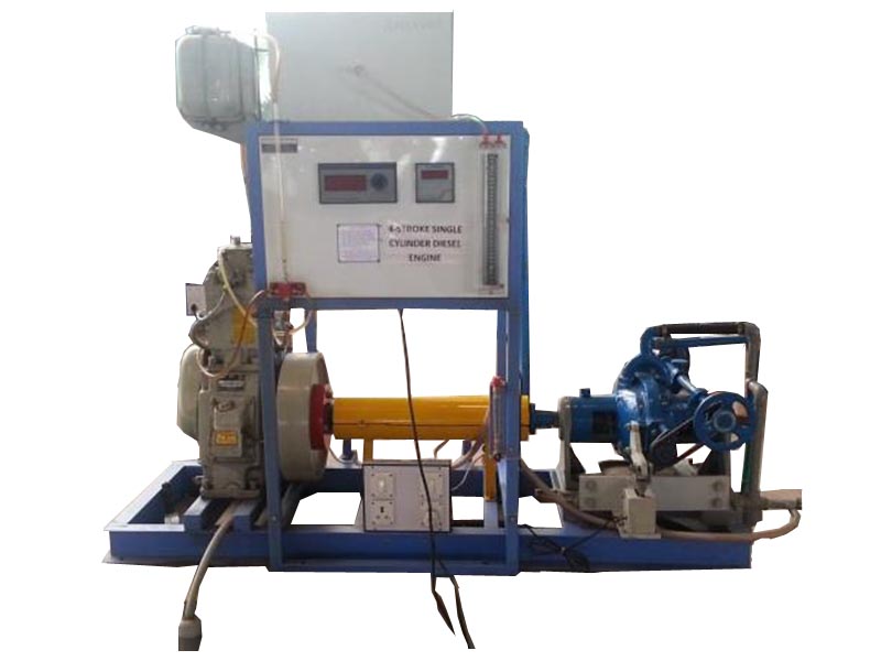 The Setup Consist of single cylinder four stroke Diesel engine (BrandNew). The variable compression ratio arrangement is made by using auxiliary piston moving up and down. The engine is coupled to the rope brake / hydraulic brake / electric / eddy current dynamometer as aloading device. The air box with orifice plate and manometer is provided for measurement of air to the engine. A fuel tank with fuel measuring unit with scale is provided. The shell and tube type calorimeter is provided at exhaust of the engine. Digital temperature indicator with thermocouple is provided for measurement of temperature at eight different locations. A speed is measured by using tachometer. A rotameter is provided for measurement of water flow to the engine and calorimeter. Load on the engine is measured by using dynamometer accessories. Necessary water and air pipe connections are provided. The entire setup mounted on sturdy MS frame with powder coated and good color combination.