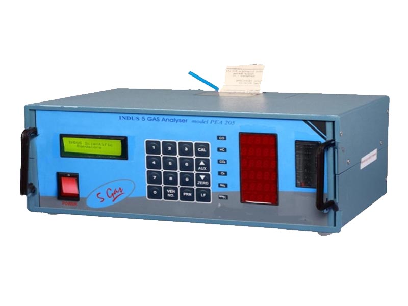 A 5-gas analyzer meant for monitoring CO, CO2, HC, O2 and NO in automotive exhaust. It meets OIML Class-I specifications. CO, CO2 and HC (Hydrocarbon residue) are measured by NDIR technology and O2 and NO by electrochemical sensors. It is also supplied as a 4-gas analyzer which can be upgraded easily to 5-gas version by the addition of an NO sensor. It has many control features to prevent faulty measurements. A built-in dot matrix printer is provided to print out a hard copy of the results. It conforms to CMVR 115/116 and is certified by ARAI, Pune.