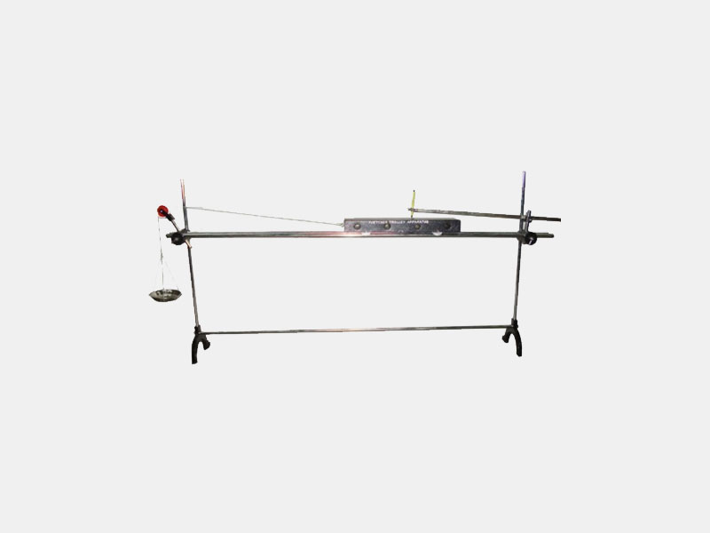 All metal capable of being assembled and dismantled easily. A large metal trolley with removable cylindrical weights is fitted with wheels which run with very little friction on a track of two steel rods 150 cm long. The rail rods are held in heavy clamps which are fitted in two vertical rods, mounted on cast iron feet. The steel vibrator is fitted to one of the vertical rods and frictionless pulley to the other. The unit is capable to verify the law under different conditions, Complete with cord scale pan, brush and ink.