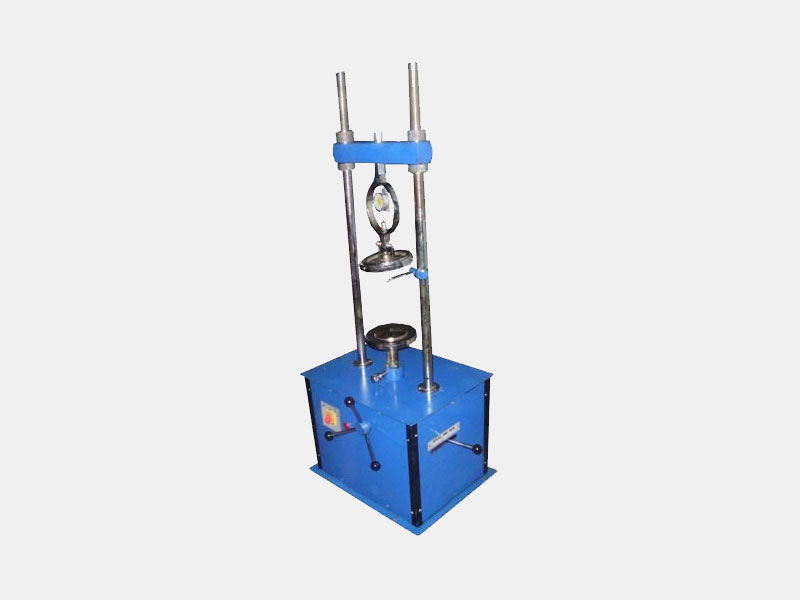 This is instrument for determining the unconfined compression strength of soil specimens of diameter ranging from 38mmto 100mm. Load on the sample is applied gradually by a hand operated load frame and loads are measured on a sensitive proving ring attached to the load frame. Comprises a screw operated load frame, cap.5000kg with a gear box and motor drive giving 1.25, 1.5, 2.5mm/min. Rates of strain, a pair of cone seating, adaptor for proving ring, and stain dial gauge bracket.