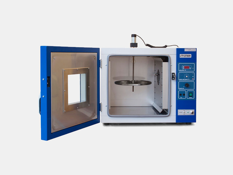 This dual purpose oven is designed to determine the loss in weight of bitumen and flux oils (Loss on Heating test) and the effect of heat and air on asphaltic materials (Thin Film test). The unit is heavily insulated and has a double glass door for viewing the test chamber thermometer and samples. Temperature is controlled at 163° C ± 1° C by means of a variable temperature controller and thermostat. Two rotating platforms are supplied with each oven: One accepts 9 standard penetration cups for the loss on heating test, the other accepts two 140mm diameter test pans for the thin film test