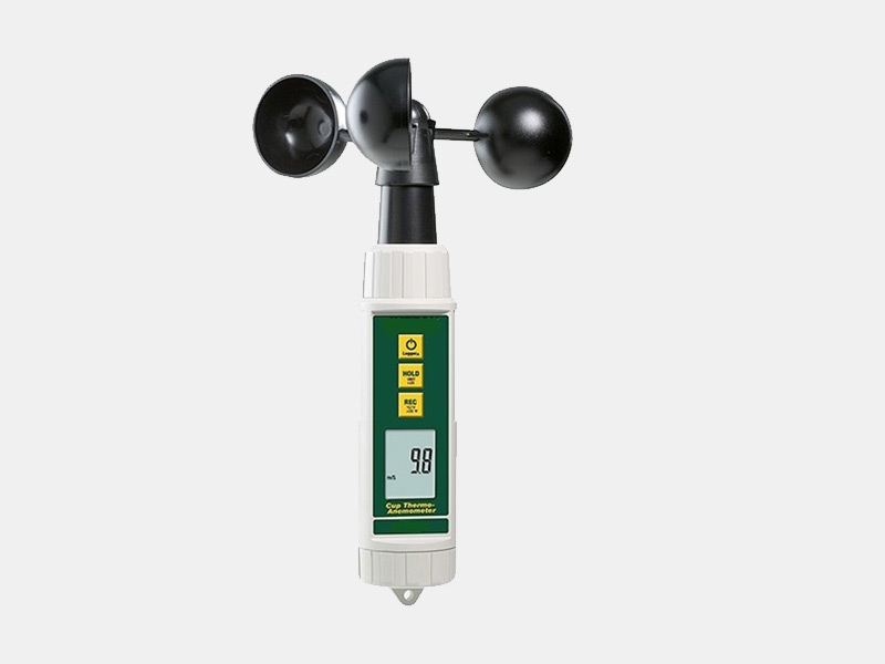 This cup thermo-anemometer is a great portable wind cup speed meter that you can hold easily in your hand to measure the speed and temperature of wind anywhere you go. The built in thermometer measures temperatures in both Fahrenheit and Celsius. It features three rotating wind cups and can measure air velocity in meters per second, ft per minute, kilometers per hour and knots on its LCD screen.