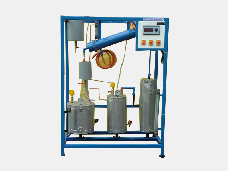 The apparatus consists of an overhead tank which contains liquid undergoing distillation. The liquid from the tank is metered through the Rota meter & then goes inside the copper coil in the boiler. Steam condenses outside the coil. The liquid then enters the flash chamber after being throttled by a valve. In the flash chamber the liquid flashes into vapors partially. The vapors are left to the condenser where they are condensed by water. Condensed vapors are collected & quantity measured. The enriched liquid at the bottom of the chamber is collected & measured.