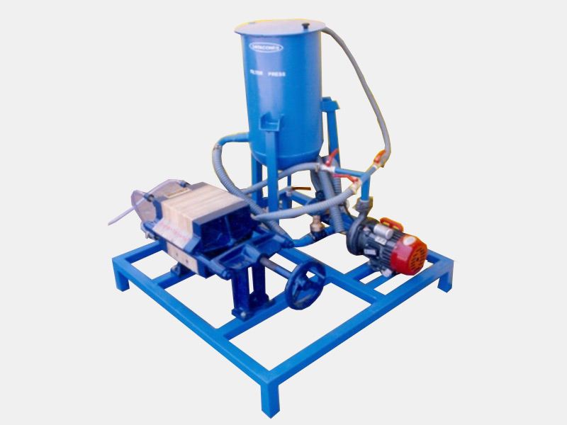 The equipment consists of five plates & six frames. The feed is allowed to the bottom individually for each plate operating separately. A wire mesh screen covered with filter paper acts as the filterte medium. The slurry tank is provided with a stirrer gear pump with by pass back to slurry tank. over head water connections can be given pressure records the pressure at the inlet to the press measuring jar is provided for collecting the filter.