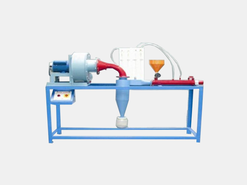 It consists of a cyclone chamber with conical bottom, compressed air is regulated with the help of valve and monitored with the help of orificemeter solids are fed through the the hopper and venturi arrangement. A plastic jar is provided to collect bottoms from the cyclone.