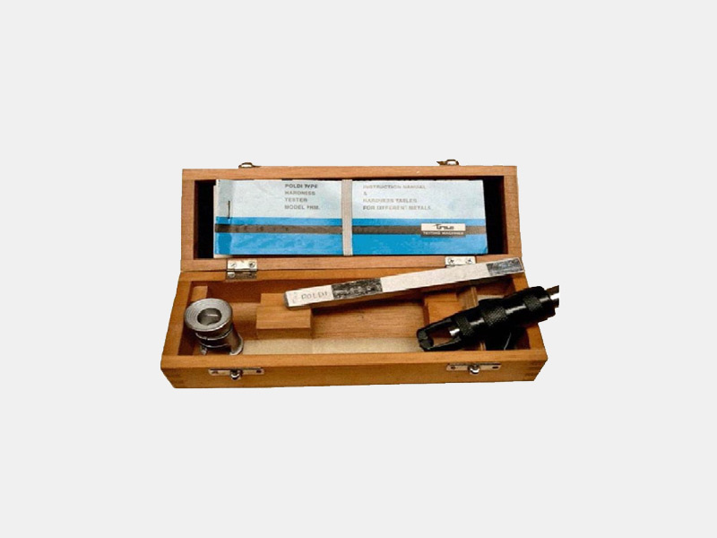 Poldi hardness test is a dynamic hardness test and can be used at any stage of processing of metals. The instrument consists of a hardened steel ball of 10mm diameter fixed to a hollow cylindrical casing; a movable plunger is fixed rigidly in the casing by means of spring. A standard test bar is inserted in the gap provided between the plunger bottom and the steel ball. The test bar is hardened for a predetermined value and is tapered for easy insertion.