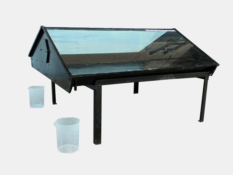 Distillation Still consists of a Black basin containing the Raw Water. The Black Basin absorbs the sunlight resulting in evaporation of the water. The pure water vapour condenses on the relatively cooler glass surface and drops on to the “formed” channel. The distilled water is collected in a carbouy through a plastic pipe.