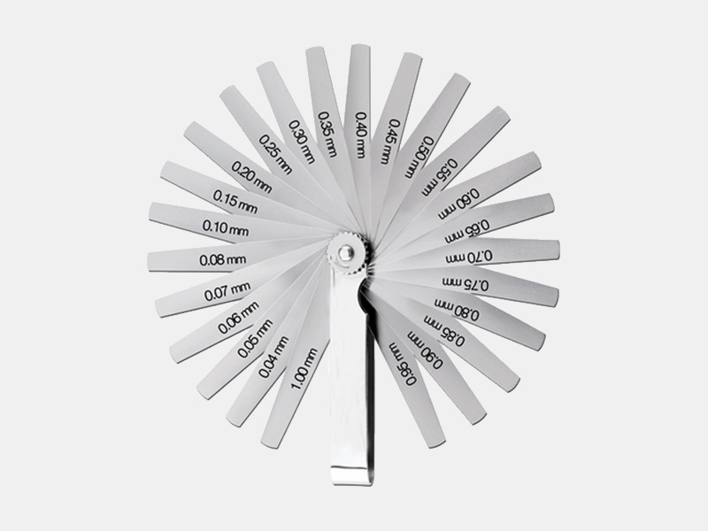 They consist of a number of small lengths of steel of different thicknesses with measurements marked on each piece. They are flexible enough that, even if they are all on the same hinge, several can be stacked together to gauge intermediate values.