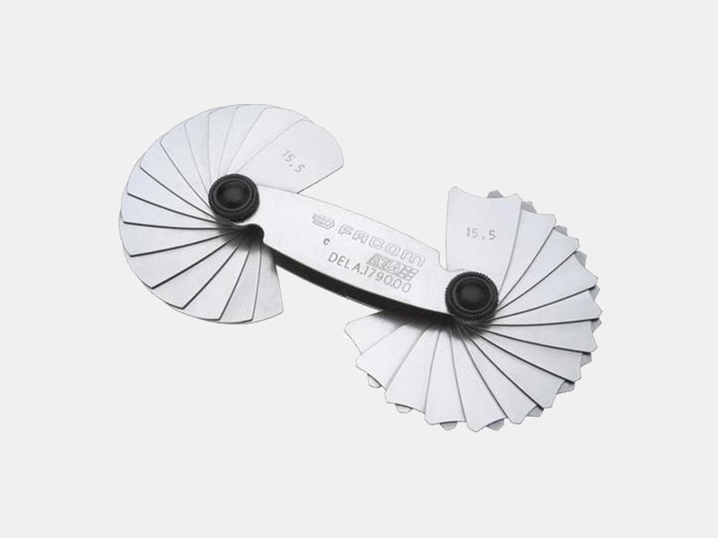 : A good set of gauges will offer both convex and concave sections, and allow for their application in awkward locations. Every leaf has a different radius. The material of the leaves is stainless steel. It is of two types: 1. Internal 2. External. It is used to check the radius of inner and outer surfaces.
