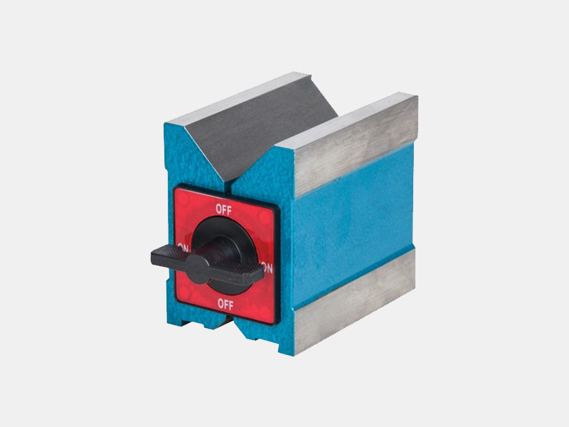 The block comprises of permanent , powerfull magnet. The holder exerts a magnetic force on the upper, lower and V-channel surfaces. Magnetic force is simply switched off by means of a lever. On-off switch for positioning and removal.