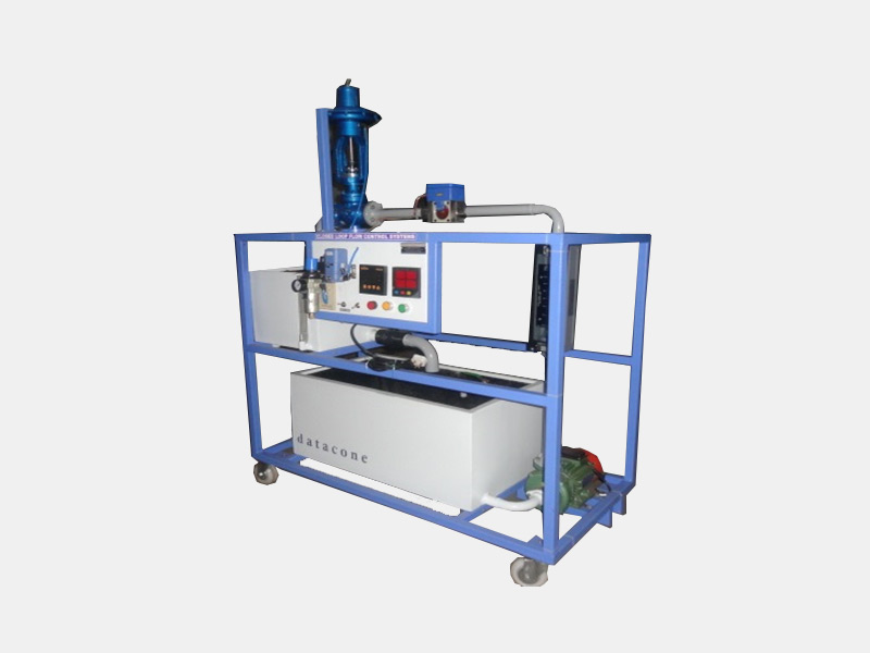 The system comprises of Pneumatic actuated diaphragm control valve , wheel flow transmitter, I/P Convertor , PID controller and air filter regulator. The set point is set on the PID Controller. The output from the flow transmitter is given to the PID controller. The output from the PID controller is given to the I/P Covertor.The I/P convertor controls the flow of air to Pneumatic actuated diaphragm control valve which ultimately controls the flow of water through the valve. A sump tank with centrifugal pump is provided. A rotameter is used to measure the flow the system. The whole setup mounted on sturdy iron frame, powder coated with good color combination.