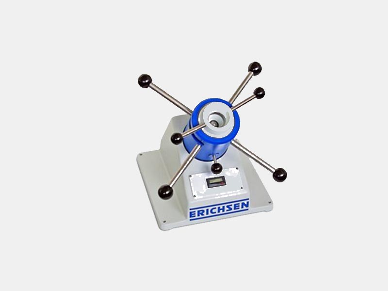 A bench mounted unit with a cast iron machine body and a cylindrical test head. To conduct the cupping test the sheet metal specimen or foil is entered into an opening through the test head. The screw-in blank holder is set for the sheet thickness using the scale provided. The test head is then tightened manually against a stop on the locating sleeve. This clamps the blank with a force of 10 kN as required by the cupping test standards mentioned above. The clutch pin is pulled outwards from the locating sleeve, the test head is turned clockwise and the cupping process commences.