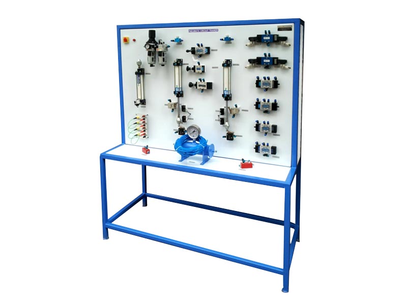 This unit is designed to support a large number of experiments that demonstrate a broad range of pneumatic principles. The experiment manual takes the step by step experiments to create a learning experience that provides a complete and practical introduction to pneumatic technology. All components such as Single acting cylinder , double acting cylinder , different control valves are securely mounted on panel and clearly identified with a description. All components are fitted with push-to-connect fittings. Two sizes of plastic tubing are supplied to connect the components to form the circuits in the exercises.