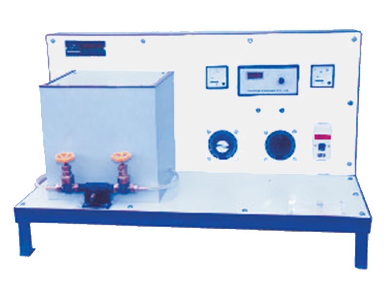 The heater plate is surrounded by a heating ring for stabilizing the temperature of the primary heater & prevents heat loss readily around its edges. The primary & guard heater are made up of mica sheets in which is wound closely spaced Nichrome wire & packed with upper & lower mica sheets. These heaters together form flat with upper & lower copper plate & rings from the heater plate assembly. Two thermocouples are used to measure the hot face temperature at the upper & lower central heater assembly copper plates. Two more thermocouples are used to check balance in both the heater inputs. Specimens are held between the heater & cooling unit on each side of the apparatus. Thermocouples No. 5 & 6 measure the temperature of the upper cooling plate & lower cooling plate respectively. The heater plate assembly together with cooling plates & specimen hold in position by 3 vertical stands & nuts on a base plate The cooling chamber is a composite assembly of grooved aluminum casting& aluminum cover with entry & exit adapters for water inlet & outlet.