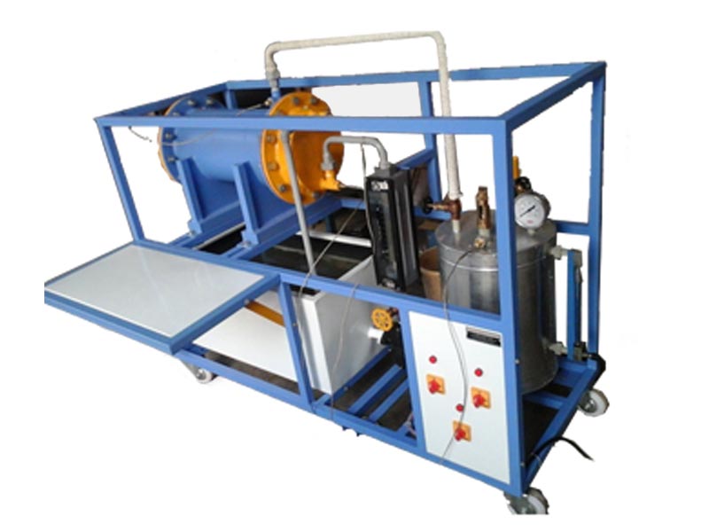 The shell and tube type horizontal condenser. Steam ( or any condensable organic vapour ) is admitted in the Shell Side. The pressure and temperature of the vapour is indicated by pressure gauge and Temperature Indicator . Condensate rate could be measured by collecting it in to a receiver in known time. The flow rate of cold water flowing through the inner pipe is known by rotameter.