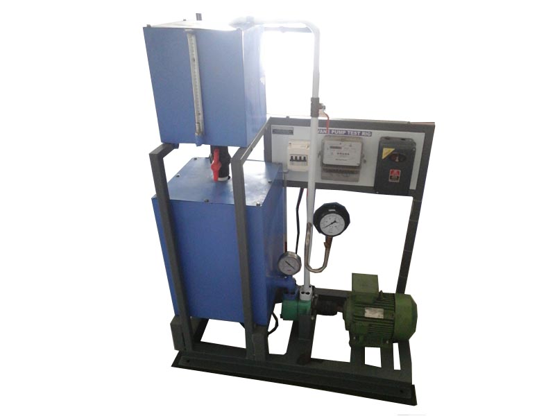 The apparatus consists Vane pump of suitable capacity.Suction and discharge pressure are measured by using vacuum and pressure gauge respectively.Flow through pump is controlled by using discharge control valve.Discharge though the pump is measured by using measuring tank. Sump Tank of suitable capacity is provided..Energy meter is provided for measurement of power consumption of pump.This system is complete closed circuit type .