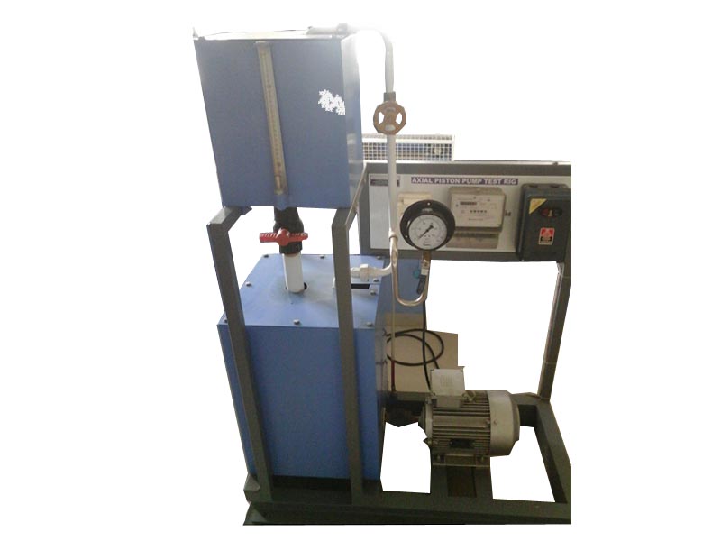The apparatus consists Axial Piston Pump of suitable capacity.Suction and discharge pressure are measured by using vacuum and pressure gauge respectively.Flow through pump is controlled by using discharge control valve.Discharge though the pump is measured by using measuring tank. Sump Tank of suitable capacity is provided..Energy meter is provided for measurement of power consumption of pump.This system is complete closed circuit type .