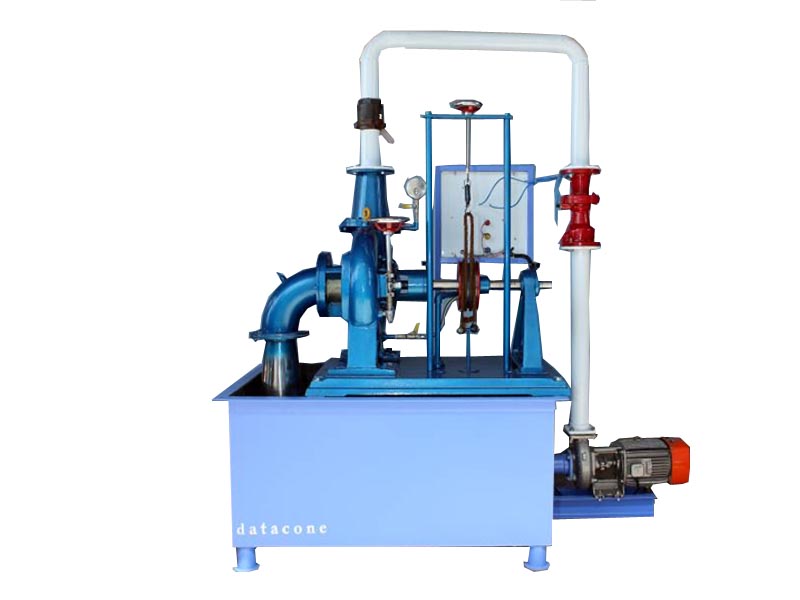 The unit consist of spiral casing , and outer bearing pedestal and rotor assembly with runner, shaft and break drum all mounted on suitable sturdy cast iron base plate. A straight conical draft tube is provided for purpose of regaining the kinetic energy from exit water and also facilitating easy accessibility of the turbine due to its location at a higher level than a trail race. A transparent hollow Perspex cylinder is provided between the draught bend and the casing for all the purpose of observation of flow at exit of runner. A rope brake arrangement is provided to load the turbine. The input to the turbine can be controlled by adjusting the guide vanes for which hand wheel and suitable link mechanism by pressure and vacuum gauge. The discharge trough the turbine is measured by using venturimeter with differential manometer. Speed of turbine is measured by using tachometer. The entire unit is powder coated with good color combination.