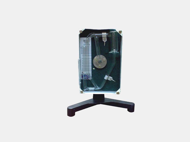This is the absolute measuring instrument for vacuum which gives pressure exerted by permanent gases. The gauge works on the principle of Boyel’s law of gases. Two parallel capillary tube are connected to a common mercury bowl. The rise of mercury column in the capillary gives the vacuum in mm/hg.This McLeod vacuum gauge is a tilting gauge with a constant zero overflow which eliminates the capillary-depression error from an expanding meniscus The SETUP Consist of glass body, stand with joint and scale.