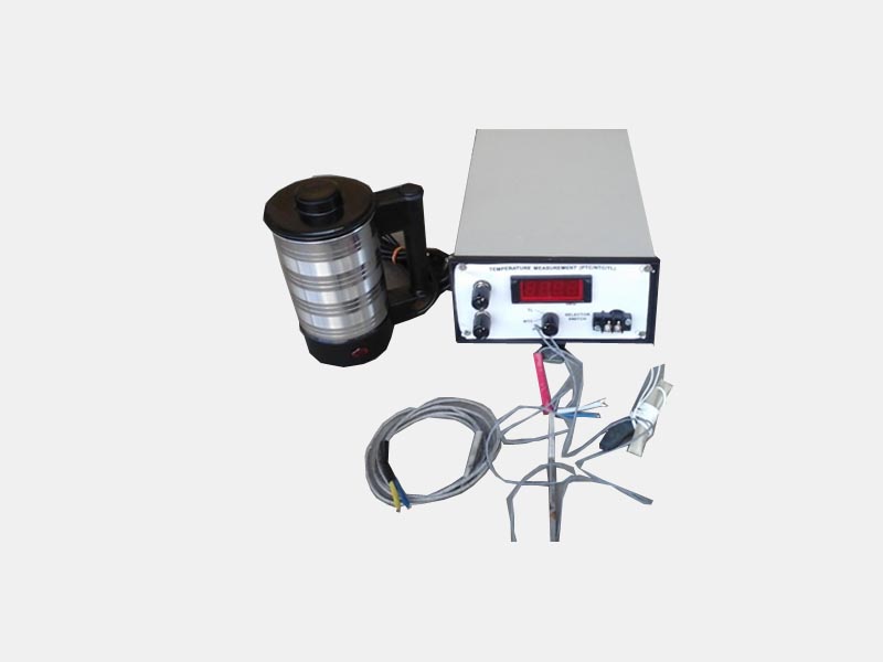 Here three types are transducers are selected & used to measure the temperature. They are – PTC i.e. PT100, NTC i.e. Thermister & very popular ‘K’ type Thermocouple . The output signal from each signal conditioning card is fed to next Microcontroller based Digital readout through a 3 Pole - 3 way Selector Switch. So at a time only one Transducer & its related circuit will be selected & actual measured temperature will be shown on Digital Read Out. An electric kettle is also provided for water bath.and also mercury glass thermometer.