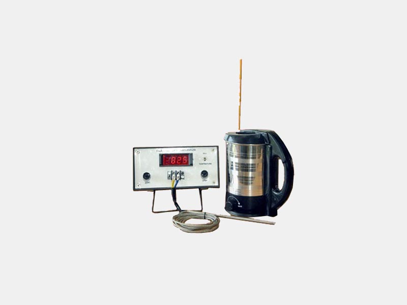Here Bimetallic Sensor is used to measure the temperature.. The output signal from signal conditioning card is fed to next Microcontroller based Digital readout & its related circuit will be selected & actual measured temperature will be shown on Digital Read Out. An electric kettle is also provided for water bath.and also mercury glass thermometer.