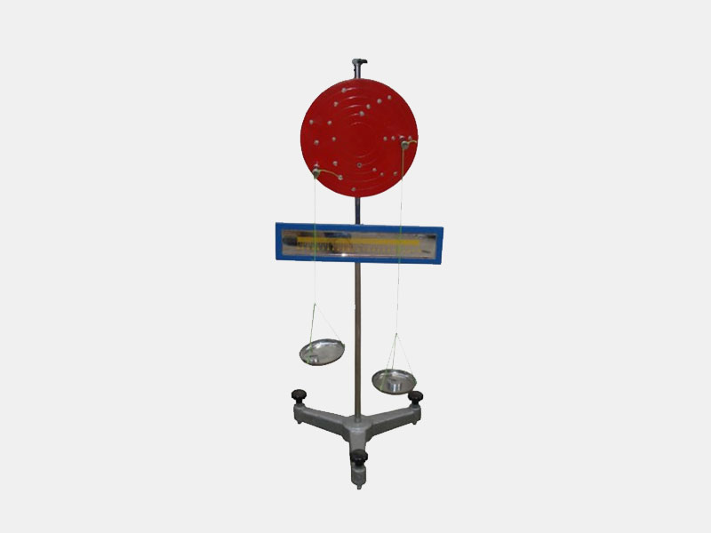 A well balanced, machined aluminum disc rotating smoothly at about its axis clamped on a tripod stand in vertical plane. The disc moving on ball bearing & has number of holes placed symmetrically in concentric circles of non diameters. Four pins carrying scale pans can be inserted into the holes at any desired position. Complete with horizontal graduated mirror scale, plum line leveling screw two side pulleys & four scale pans.