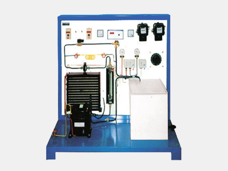 The equipment consist of hermetically sealed compressor, condenser , expansion device and evaporator. The high pressure and high temperature compressed gas is passed through the air cooled condenser where its temperature drops down and it will come in liquid phase . The flow rate of liquid phase gas is measured by using rotameter, goes to expansion device where its temperature drops down. From expansion device gas goes to evaporator. From evaporator it will come to compressor and refrigeration cycle is completed. Temperature is measure across condenser and evaporator inlet and outlet respectively. Compressor suction and discharge side pressure is also measured. The panel consists of switches, energy meter, pressure gauges, HP/LP cutout , Thermostat.