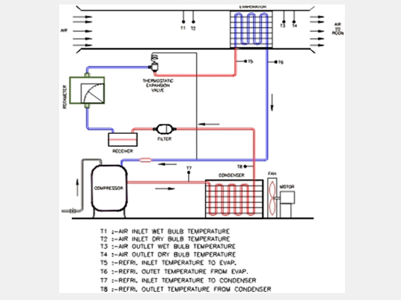 The equipment consists of a hermetically sealed compressor, air cooled condenser, blower unit to force air through a duct mounted on frame, an evaporator adopted in the duct, heaters of suitable capacity are clamped in the duct. The power to the heater can be controlled & the air is warmed while it passes over the heater. Rotameter is used in the regeneration circuit which measures the flow of refrigerant (R-134a). The mass flow rate in the duct can be varied by arrangement provided on the blower unit. There is arrangement provided on the blower unit. There is an arrangement for humidification achieved by introducing steam in the duct. The relative humidity of air at inlet & outlet can be measured by a dry/wet bulb thermometer. An expansion valve is provided in the circuit for throttling the gas from HP to LP. There are two gauges for measurement of high & low pressure. Four thermocouples are placed to measure the temperature of gas at the evaporator & condenser, with help of digital temperature indicator. HP/LP cut out is provided for the safety of compressor. The duct is insulated from out side to avoid the heat loss. The control panel consists of switches starter, voltmeter ammeter etc. The measurement of power consumption of compressor by using energymeter. The refrigeration circuit & duct are mounted on a fabricated frame. The blower driven by motor is mounted on separate frame.