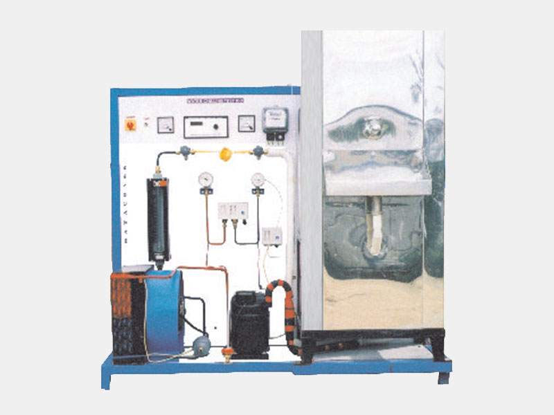 The equipment consist of hermetically sealed compressor, condenser , expansion device and evaporator. The high pressure and high temperature compressed gas is passed through the air cooled condenser where its temperature drops down and it will come in liquid phase . The flow rate of liquid phase gas is measured by using rotameter, goes to expansion device where its temperature drops down. From expansion device gas goes to evaporator. From evaporator it will come to compressor and refrigeration cycle is completed. Temperature is measure across condenser and evaporator inlet and outlet respectively. compressor suction and discharge side pressure is also measured. The panel consists of switches, energy meter, pressure gauges, HP/LP cutout , Thermostat.