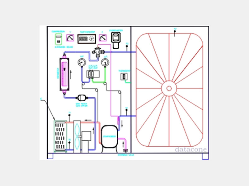 The equipment consist of hermetically sealed compressor, condenser , expansion device and evaporator. The high pressure and high temperature compressed gas is passed through the air cooled condenser where its temperature drops down and it will come in liquid phase . The flow rate of liquid phase gas is measured by using rotameter, goes to expansion device where its temperature drops down. From expansion device gas goes to evaporator. From evaporator it will come to compressor and refrigeration cycle is completed. Temperature is measure across condenser and evaporator inlet and outlet respectively. Compressor suction and discharge side pressure is also measured. The panel consists of switches, energymeter, pressure gauges, HP/LP cutout , Thermostat.